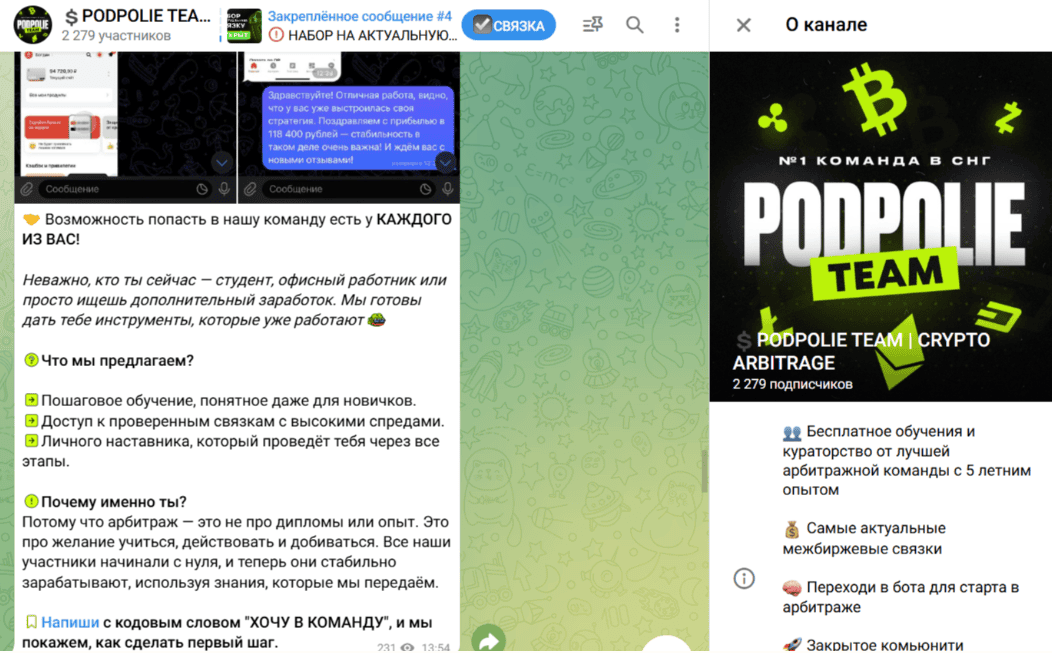 В Telegram всё чаще появляются проекты, которые обещают стабильный доход на криптовалютных связках и арбитраже. Один из них — PODPOLIE TEAM | CRYPTO ARBITRAGE, называющий себя «№1 командой в СНГ». Создатели уверяют, что готовы обучить любого новичка зарабатывать на арбитраже, даже без опыта и знаний.