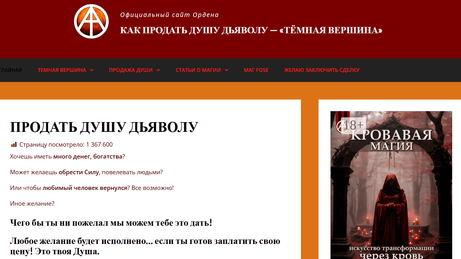 Интернет-пространство переполнено обещаниями лёгких денег, любви и успеха. Но иногда подобные предложения переходят грань допустимого. Один из таких случаев — сайт Prodatdushu.ru, где пользователям предлагают буквально продать душу дьяволу за исполнение любого желания.