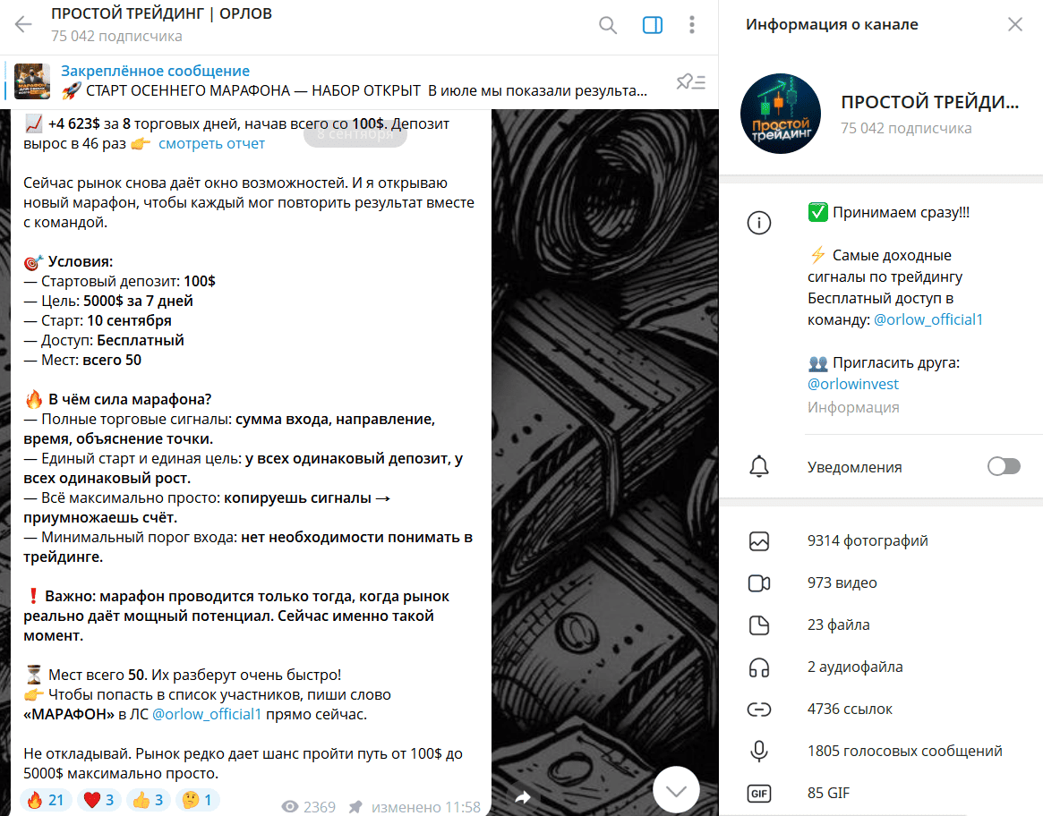 На момент написания обзора в канале числится более 75 000 подписчиков. Основная «фишка» проекта — проведение так называемых марафонов по трейдингу, где участникам предлагают повторять сигналы «эксперта» и якобы зарабатывать огромные деньги.