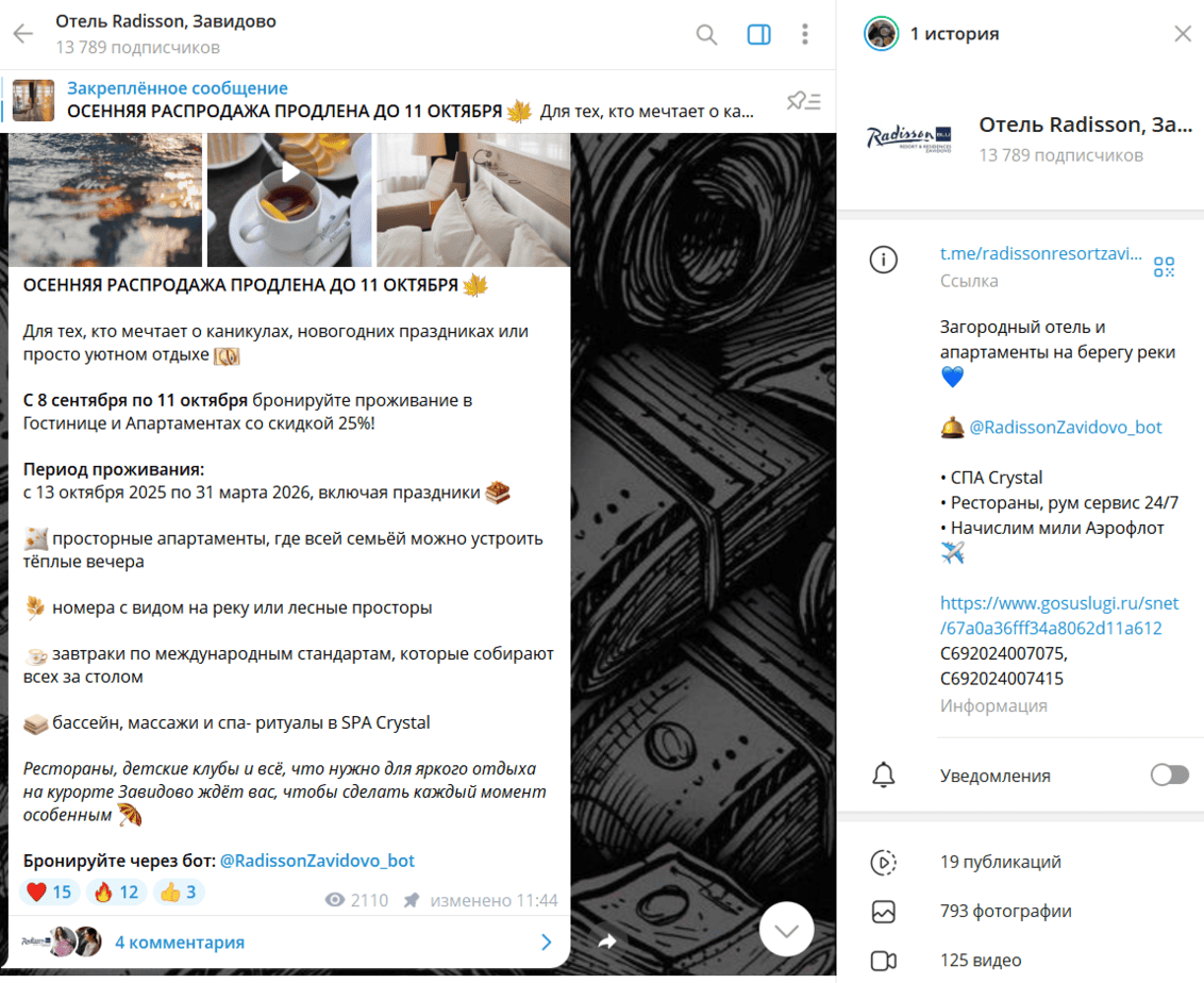 В закреплённых сообщениях публикуются акции вроде «Осенняя распродажа продлена до 11 октября — скидка 25% на проживание». Всё выглядит официально: даты, условия, фотографии номеров, обещания вида на реку, бассейнов и массажа. Но если внимательно посмотреть — всё это типичный шаблон фейкового турагентства, которое не имеет отношения к настоящей сети Radisson Hotel Group.