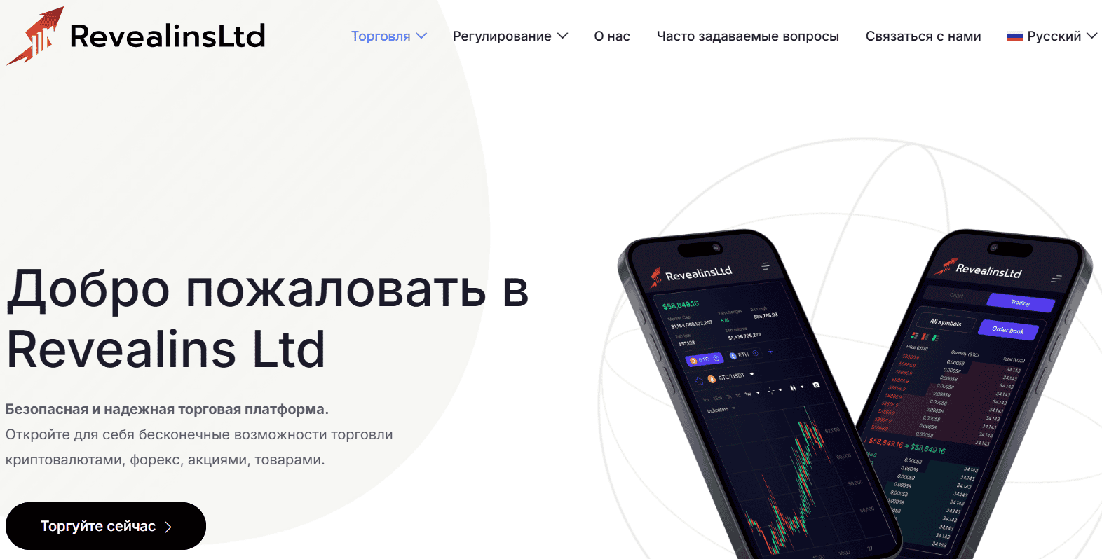 Revealins Ltd позиционирует себя как надёжную и безопасную торговую платформу для работы с криптовалютами, форексом, акциями и товарами. На сайте обещают профессиональные цены, глобальный доступ, современные технологии и высокий уровень защиты средств.