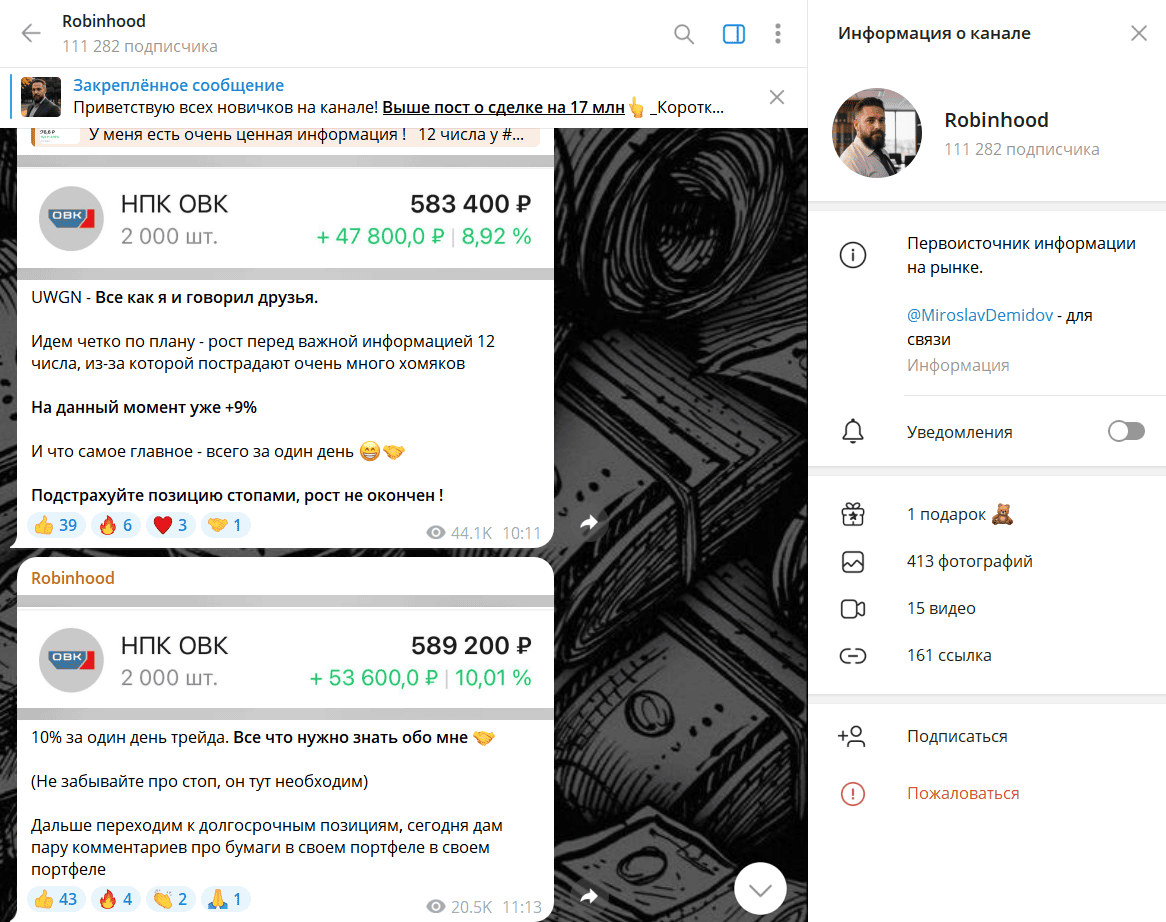 Robinhood — популярный Telegram-канал с более чем 100 000 подписчиков, где автор выдаёт себя за опытного трейдера и аналитика фондового рынка. На странице говорится: «Первoисточник информации на рынке», а в постах публикуются “сигналы” и “инсайды” о росте акций.