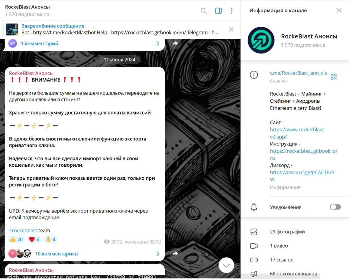 Канал RockeBlast Анонсы, посвящённый майнингу, стекингу и аирдропам Ethereum в сети Blast, насчитывает около 1,5 тысяч подписчиков. Создатели позиционируют его как пространство для «честного заработка» на криптовалютных инструментах, при этом активно ссылаются на собственный сайт, инструкции и Discord-сообщество. Но чем на самом деле является этот проект и что говорят пользователи?