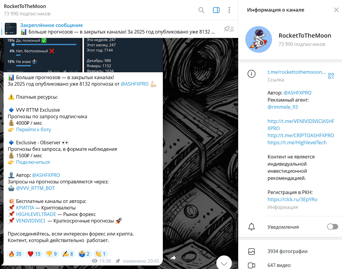 Канал RocketToTheMoon, собравший почти 74 тысячи подписчиков, позиционирует себя как один из самых крупных Telegram-ресурсов по прогнозам на криптовалюту и рынок форекс. На главной странице канала указано, что только за 2025 год автор якобы опубликовал уже более 8 132 прогнозов. Цифра внушительная, и именно такие масштабы создают у новичков иллюзию надёжности. Но что стоит за красивыми цифрами и обещаниями?