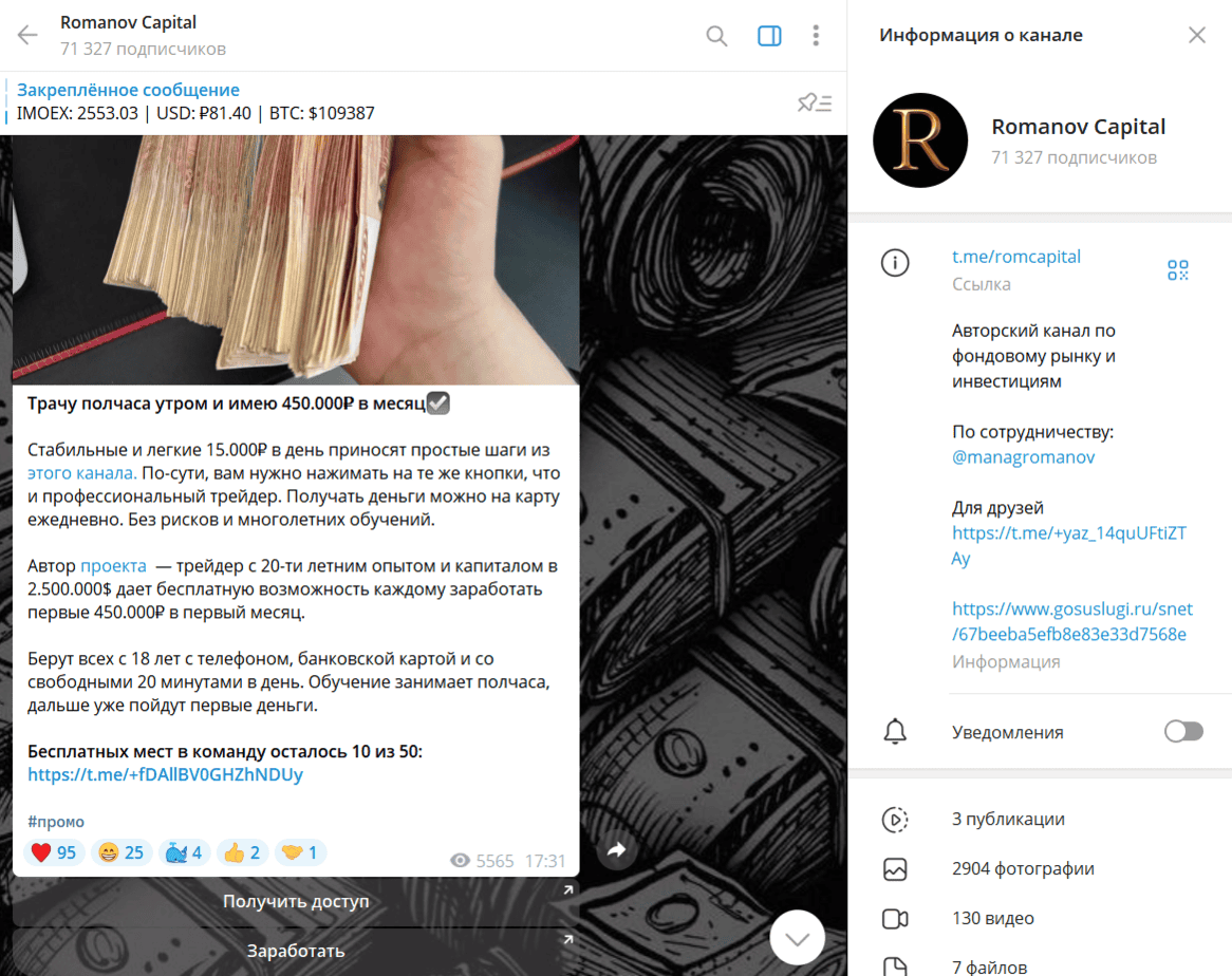 В Telegram всё чаще появляются якобы профессиональные каналы о фондовом рынке, обещающие лёгкий доход, быстрые результаты и обучение от “экспертов с 20-летним опытом”. Один из таких проектов — Romanov Capital (t.me/romcapital), который уже собрал более 70 000 подписчиков.