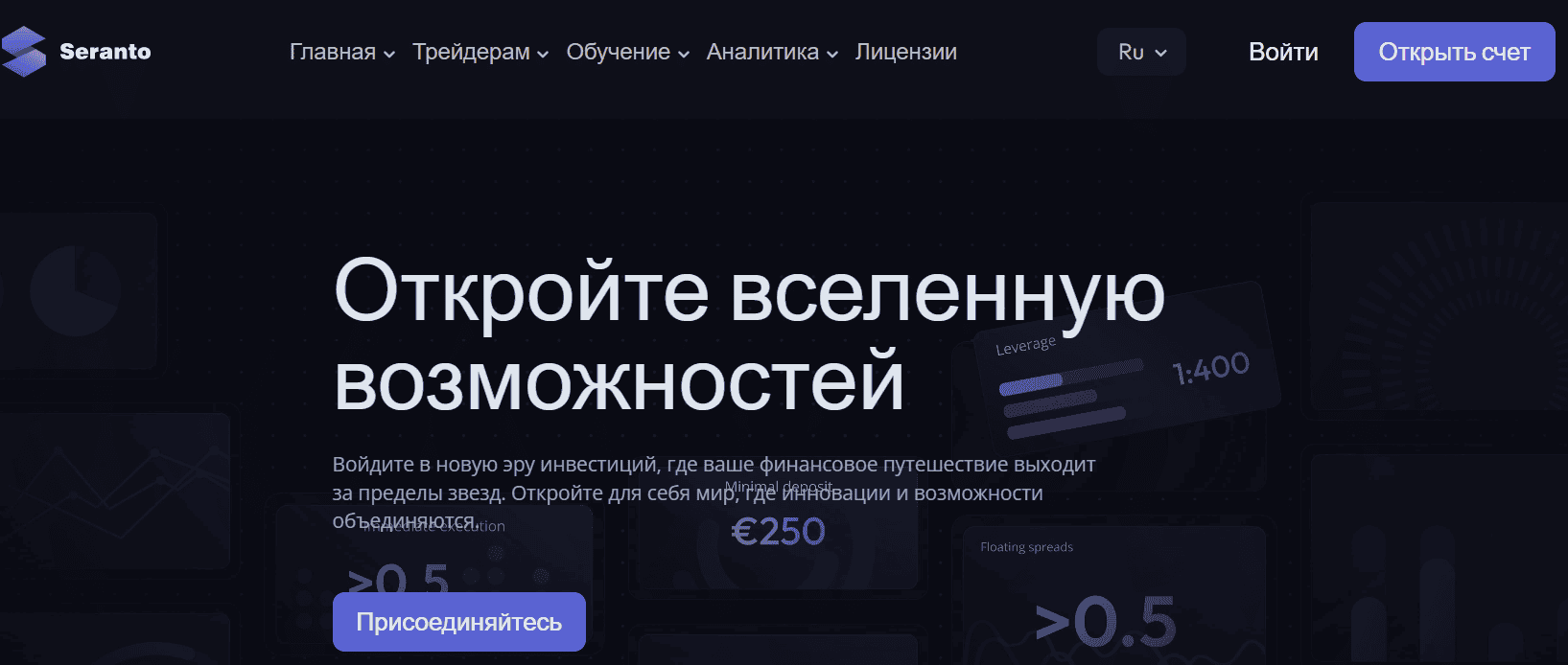 Компания Seranto обещает пользователям лёгкий доступ к мировым рынкам и современным инвестиционным решениям. На сайте размещены яркие лозунги: «Откройте вселенную возможностей», «Инновации и трейдинг без границ».