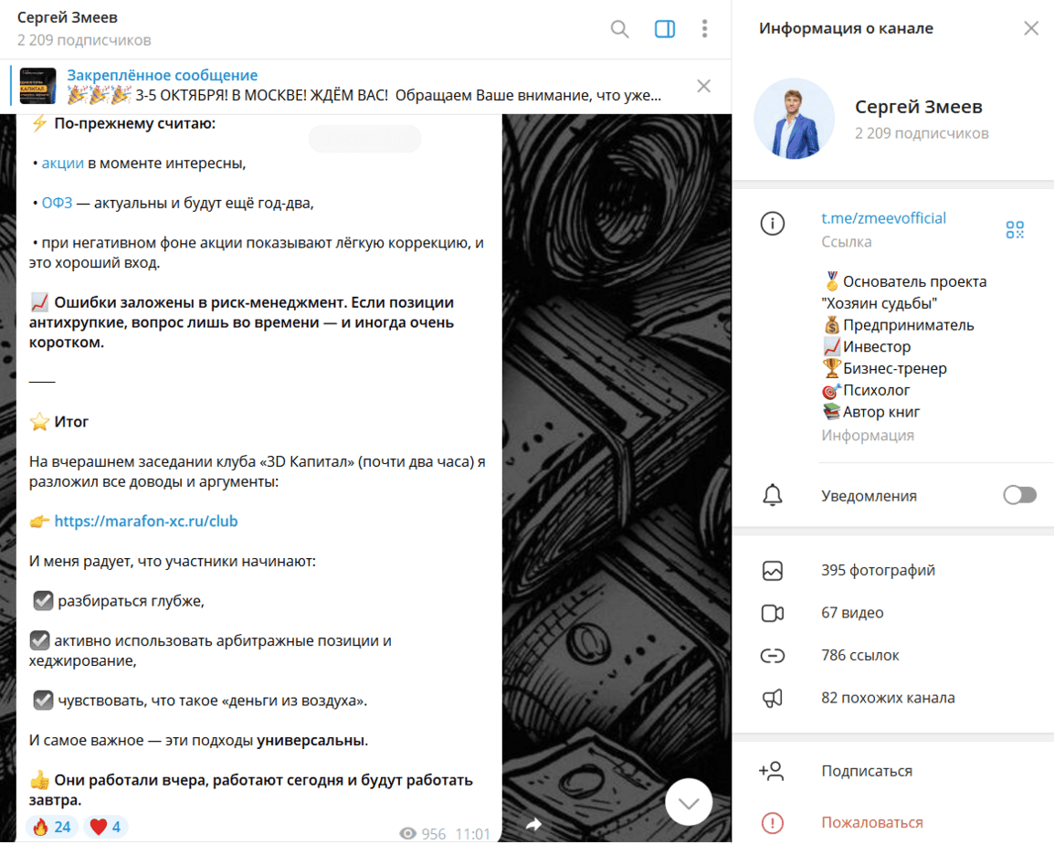 Сегодня в Telegram можно найти множество каналов, авторы которых позиционируют себя как успешные инвесторы, бизнес-тренеры или даже «гуру психологии и личностного роста». Один из таких — Сергей Змеев. В описании он называет себя предпринимателем, инвестором, бизнес-тренером, психологом и автором книг.