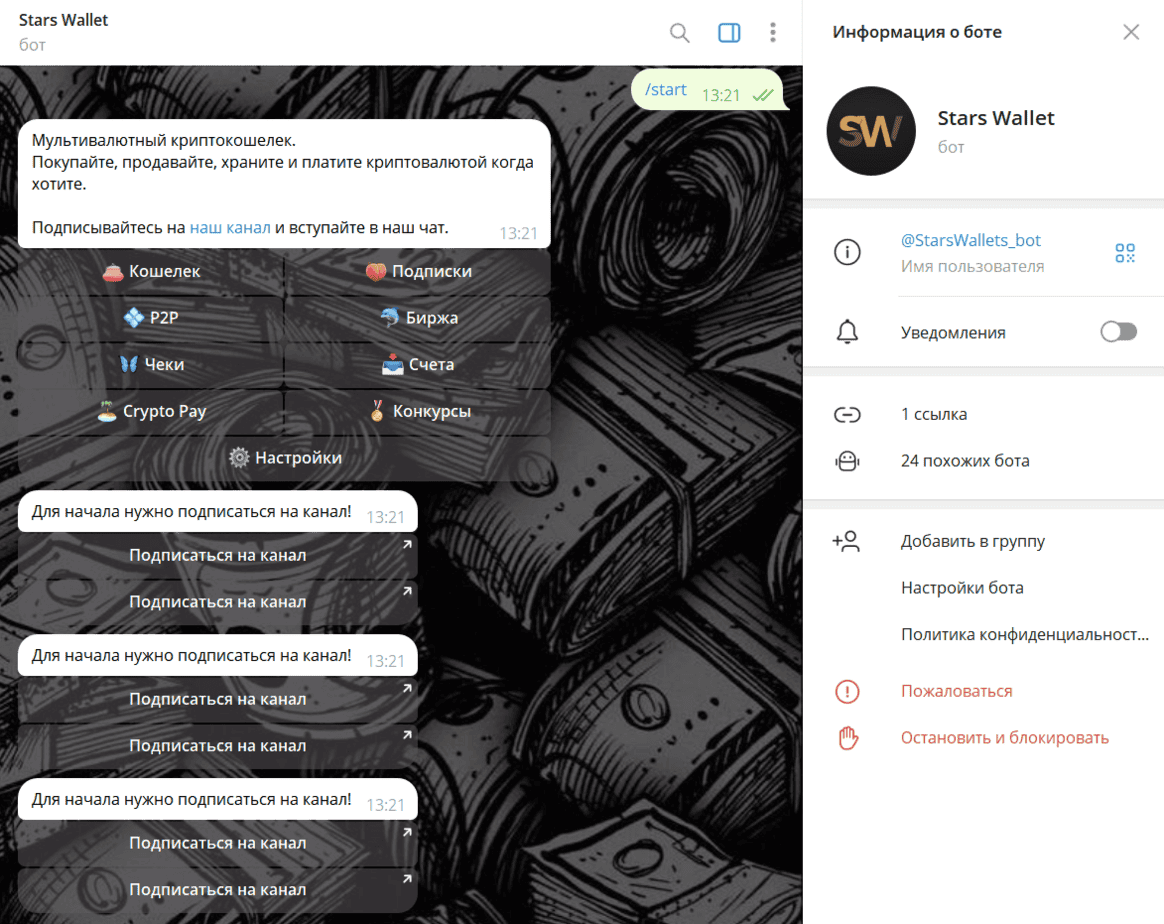 Обязательная подписка. Доступ к функциям блокируется, пока пользователь не подпишется на связанный Telegram-канал. Обещания удобства. Продвигается идея, что бот заменит сразу и кошелёк, и биржу, и систему переводов.