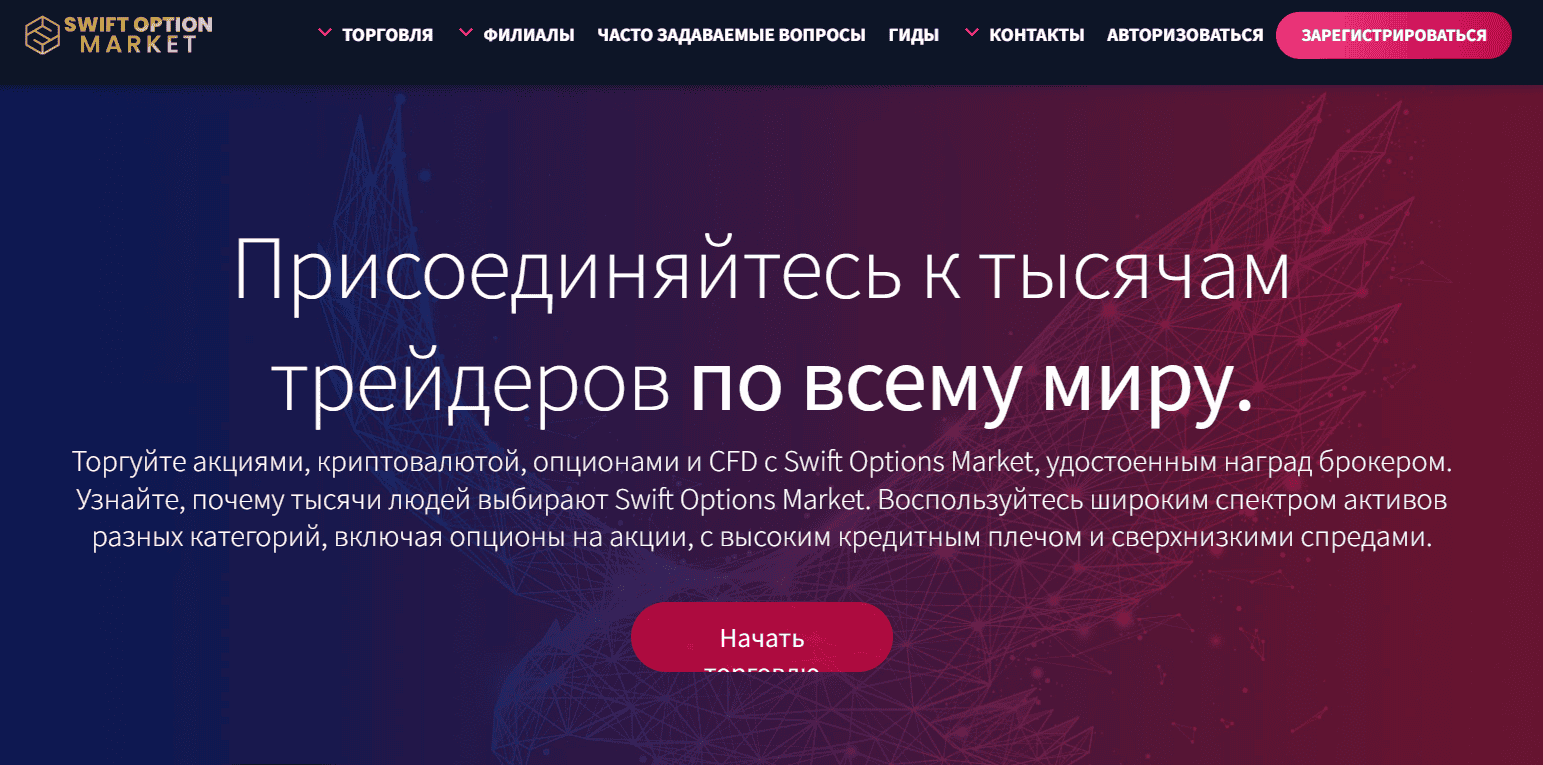 Swift Option Market позиционирует себя как международную платформу для торговли акциями, криптовалютой, опционами и CFD. На сайте заявлены круглосуточная поддержка, быстрый вывод средств и высокая безопасность. Но факты, собранные из открытых источников, говорят об обратном. Перед нами типичный пример псевдоброкера, который использует агрессивный маркетинг и поддельные обещания для привлечения новичков.