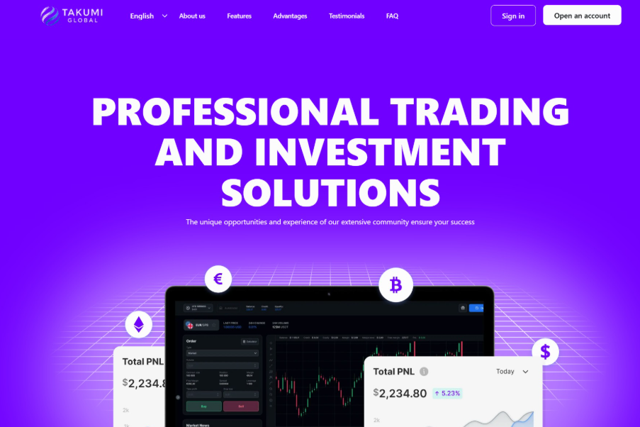 Takumi Global продвигает себя как универсальную торговую платформу для криптовалют, форекса, акций и сырья. На сайте используются яркие маркетинговые лозунги о “профессиональных инвестиционных решениях”, быстром исполнении сделок и глобальной поддержке.