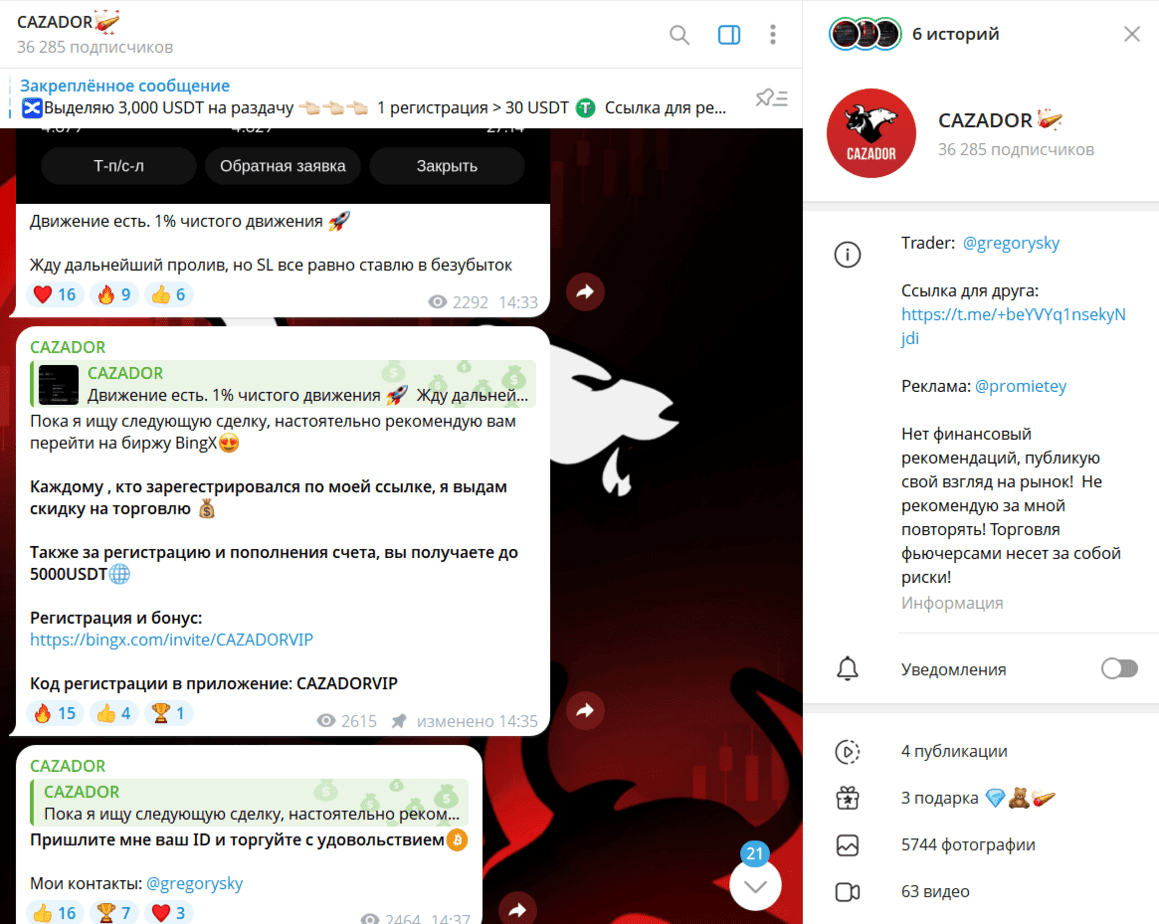 В последние годы Telegram стал одной из главных площадок для финансовых сообществ и трейдерских чатов. Каналы обещают «инсайды», сигналы и лёгкий заработок на биржах. Одним из популярных подобных проектов является CAZADOR, где публикуются торговые рекомендации и ссылки для регистрации на криптобиржах. У канала более 36 тысяч подписчиков, что создаёт впечатление доверия. Но стоит ли на самом деле ориентироваться на сигналы автора и можно ли верить таким проектам?