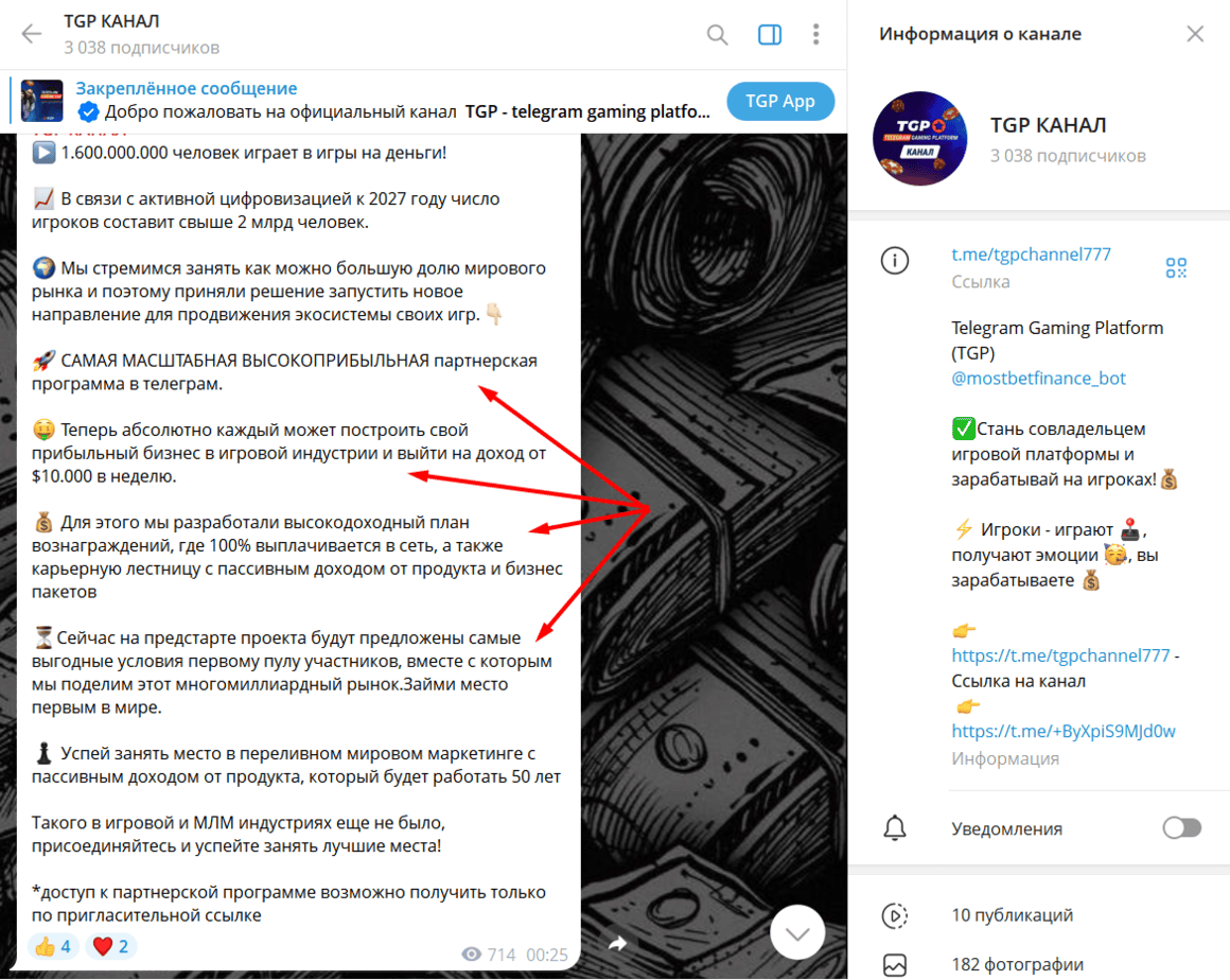 Телеграм-канал TGP КАНАЛ (t.me/tgpchannel777) представляет себя как часть “мировой игровой индустрии”, обещая пользователям высокий доход и возможность стать “совладельцем платформы”. Но за громкими лозунгами о “Web-3”, “децентрализации” и “партнёрской программе” скрывается очередная финансовая пирамида, использующая псевдо-технологическую риторику для выманивания денег.