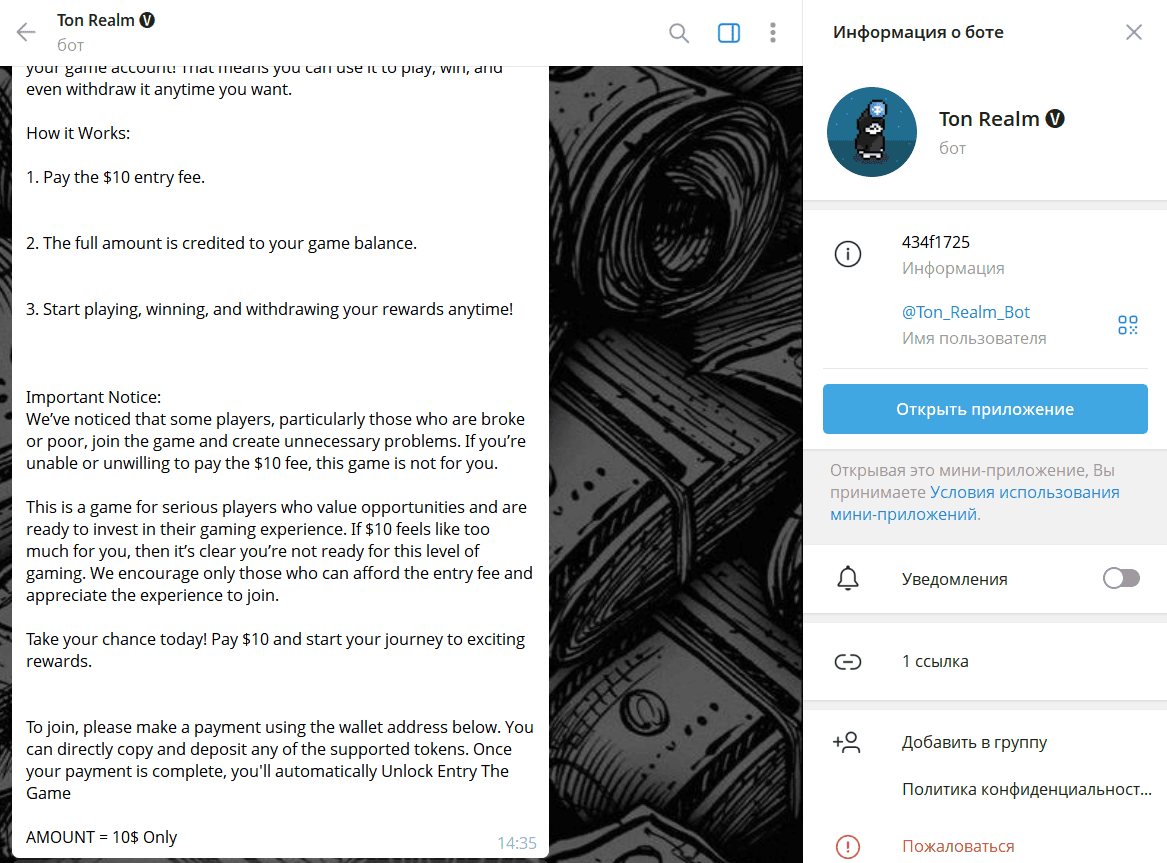 Чтобы начать игру, бот предлагает оплатить вступительный взнос 10 долларов. Пользователю обещают, что эта сумма якобы зачисляется на игровой баланс и её можно вывести в любой момент. На этом этапе уже появляются тревожные признаки сомнительной схемы.