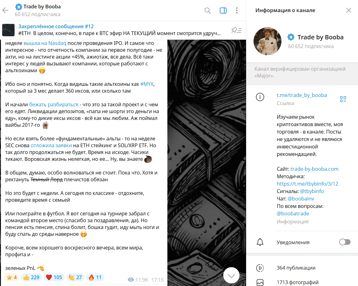 Trade by Booba — крупный Telegram-канал с более чем 60 тысячами подписчиков, позиционирующий себя как «аналитический блог о рынке криптоактивов».