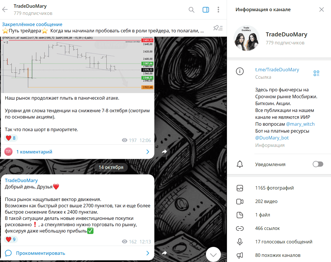 В Telegram-канале TradeDuoMary публикуются материалы о торговле фьючерсами на Московской бирже, а также аналитика по акциям и криптовалютам. Проект представлен двумя женщинами, которые позиционируют себя как профессиональных трейдеров с опытом работы на срочном рынке.