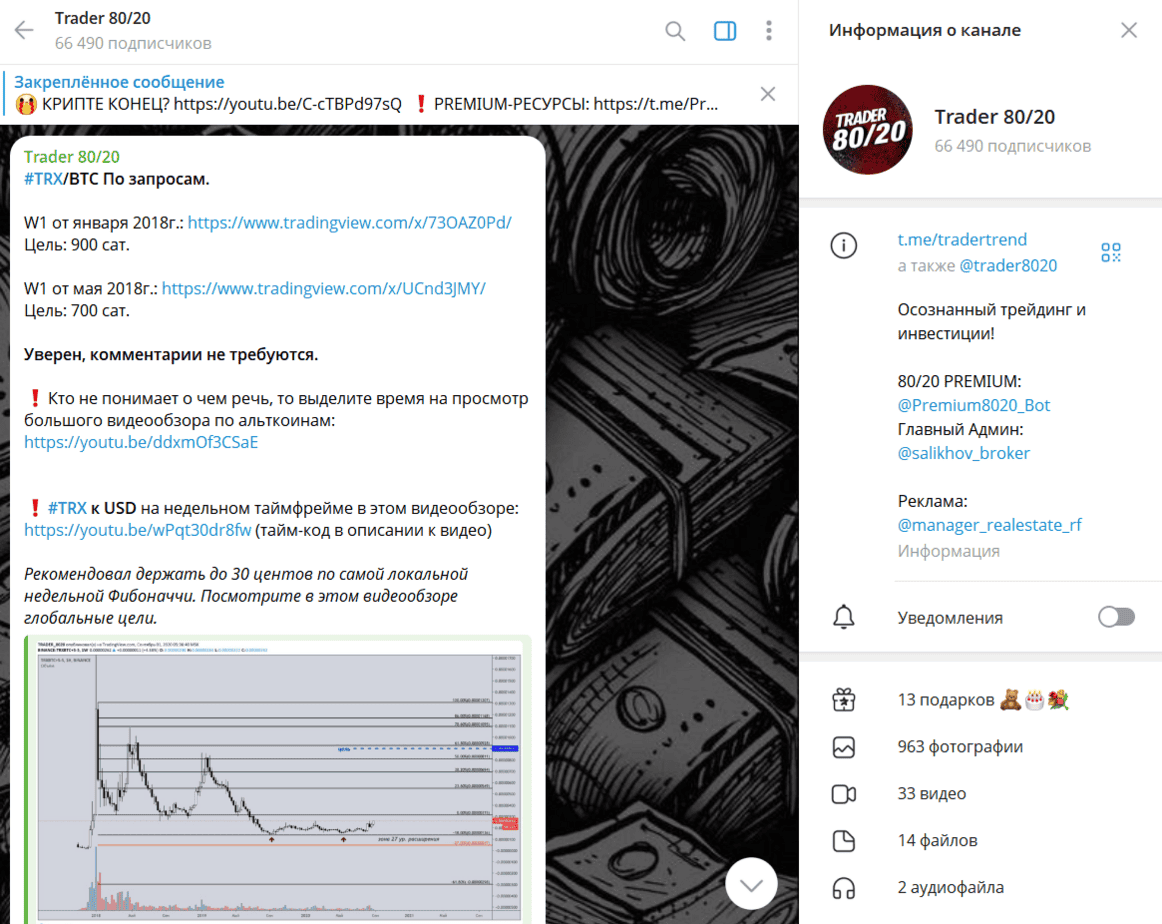 Канал Trader 80/20 позиционирует себя как сообщество для осознанных инвесторов. Его создатели публикуют графики, технические анализы и обзоры альткоинов. Основной акцент сделан на платной подписке 80/20 PREMIUM, подключение к которой осуществляется через Telegram-бота @Premium8020_Bot.