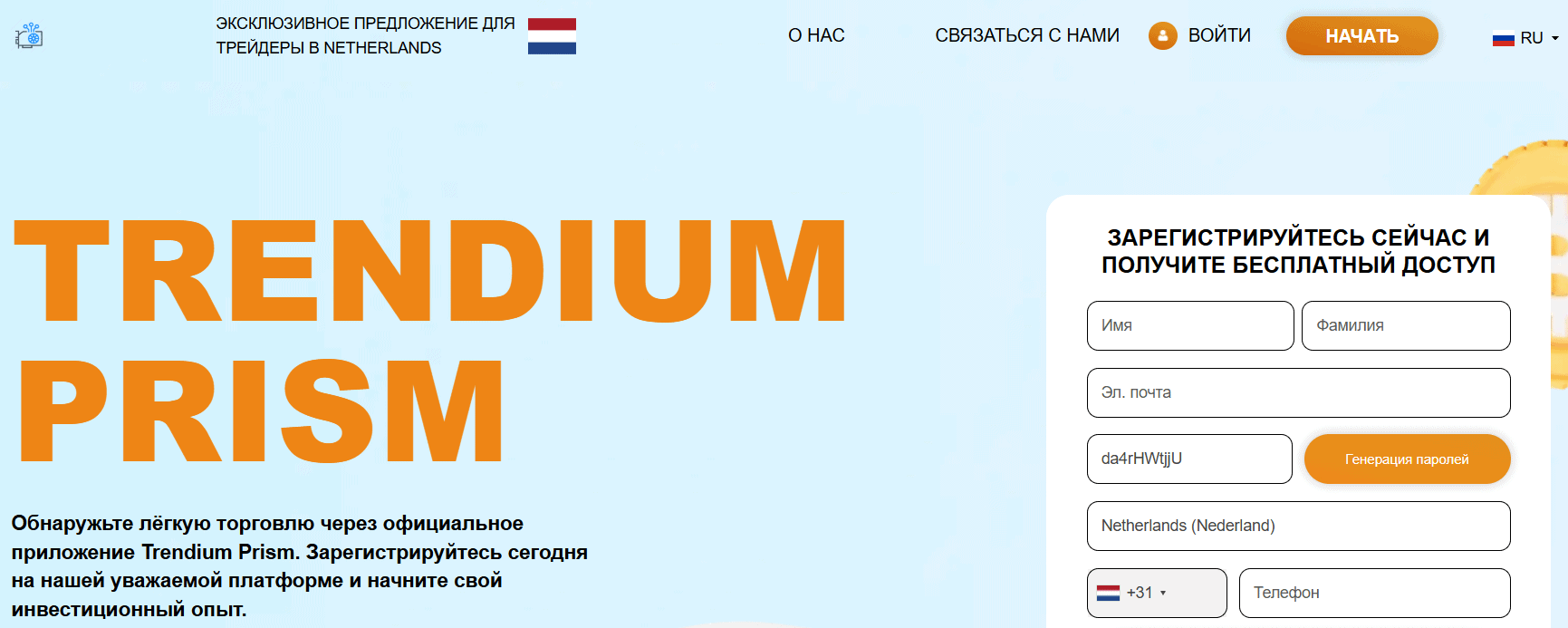 Trendium Prism продвигается как современная инвестиционная платформа с демо-торговлей, передовыми сигналами и высоким уровнем безопасности. Пользователям обещают простой вход, защиту данных и удобное приложение для торговли. Отдельно подчёркивается работа в Европе и ориентация на трейдеров из Нидерландов.