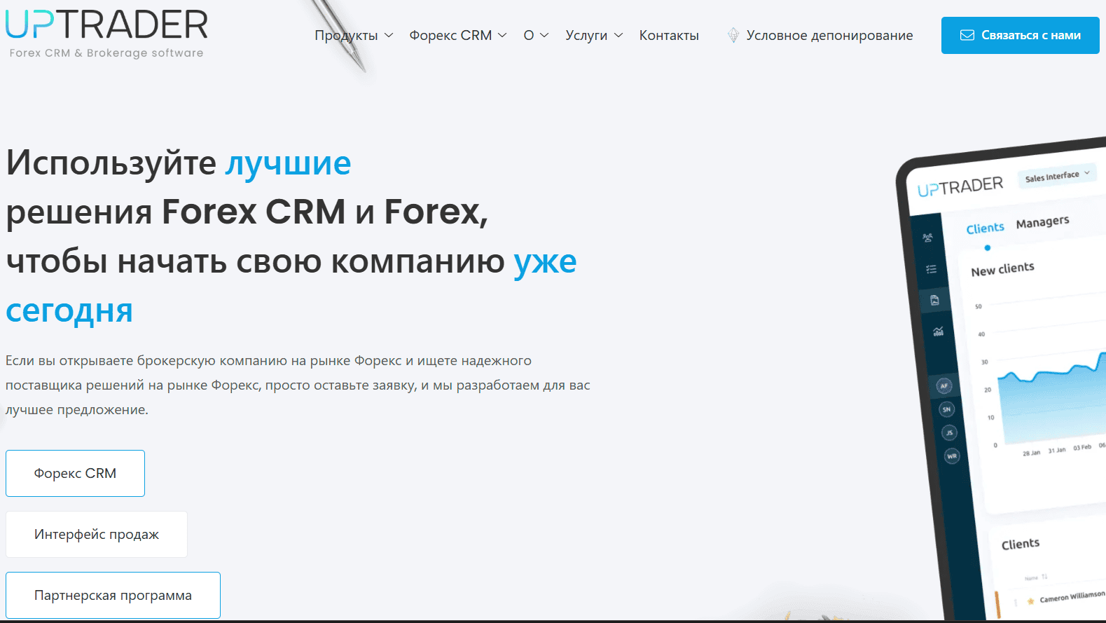 UpTrader — это IT-платформа для брокерских компаний. По сути, она продаёт техническую инфраструктуру: CRM-систему, трейдерский кабинет, модуль партнёрских программ, социальную торговлю и проп-трейдинг. Любой желающий может “купить” готовый брокер под своим брендом и начать принимать клиентов.