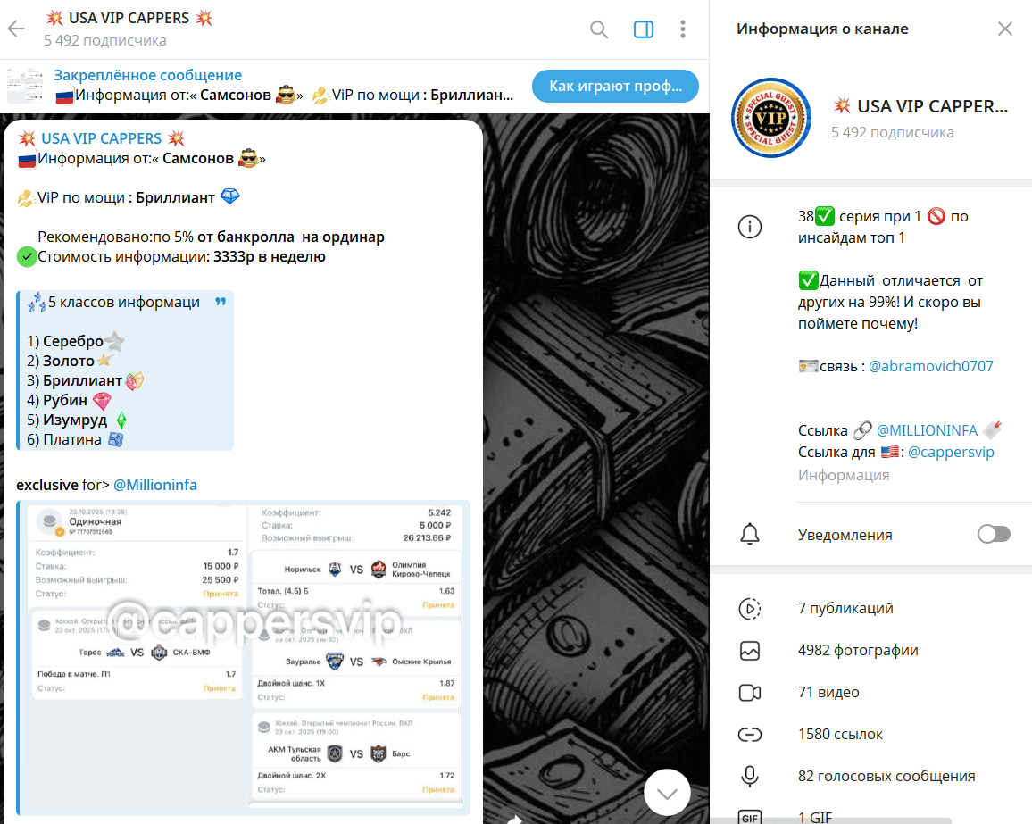 Канал USA VIP CAPPERS в Telegram предлагает пользователям «точную инсайдерскую информацию» от якобы профессиональных аналитиков и «проверенных источников». Администраторы утверждают, что имеют доступ к эксклюзивным данным и делятся прогнозами с высокой проходимостью.