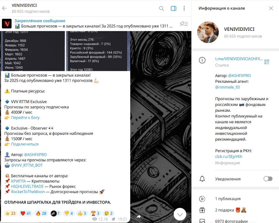 На волне популярности Telegram-аналитики многие каналы стали продавать доступ к «эксклюзивным прогнозам» и «точным сигналам». Одним из таких проектов стал VENIVIDIVICI — канал с десятками тысяч подписчиков, где автор под ником ASHFXPRO публикует технические прогнозы по акциям и криптовалютам.