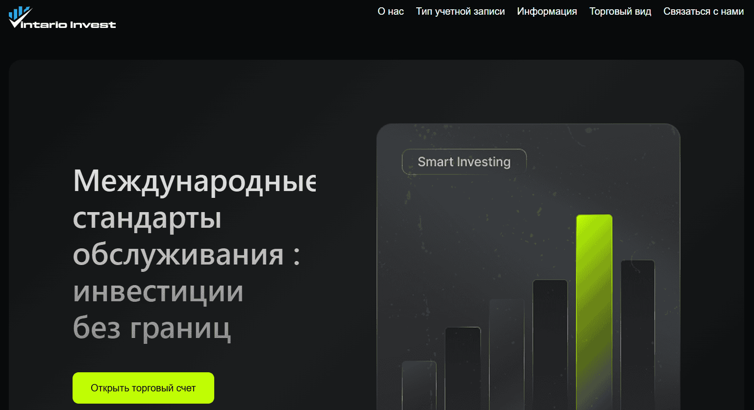 На сайте vintarioinvest.com обещают “инвестиции без границ”, “международные стандарты обслуживания” и “устойчивый рост”. Красивые слова, чёрный фон, зелёные акценты — всё, как в типичной маркетинговой обёртке финансовой пирамиды. За громкими лозунгами — пустота и никаких реальных доказательств легальности деятельности.