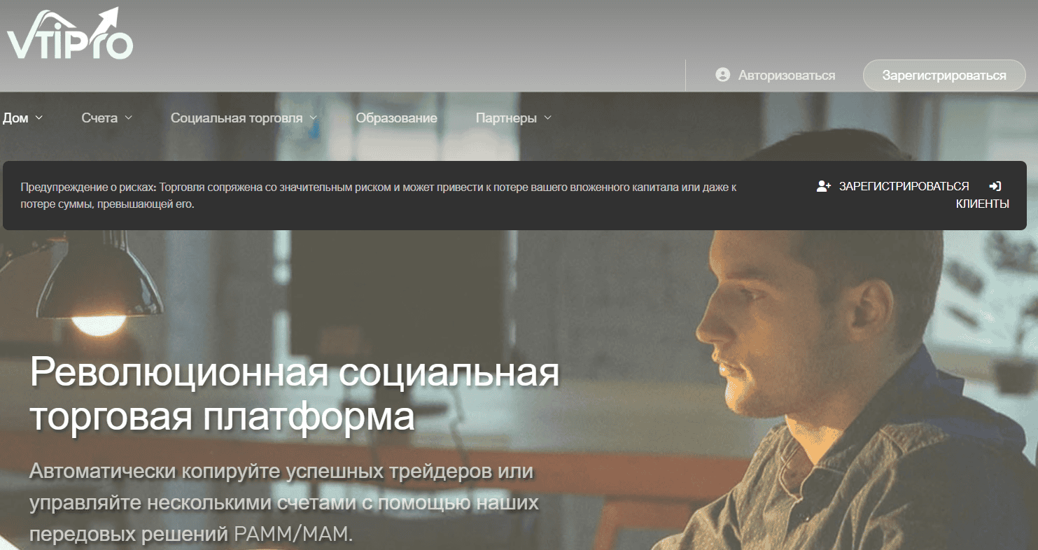 Платформа VTIPro позиционирует себя как современный брокер, предлагающий социальную торговлю, автоматическое копирование сделок и управление капиталом через решения PAMM/MAM.