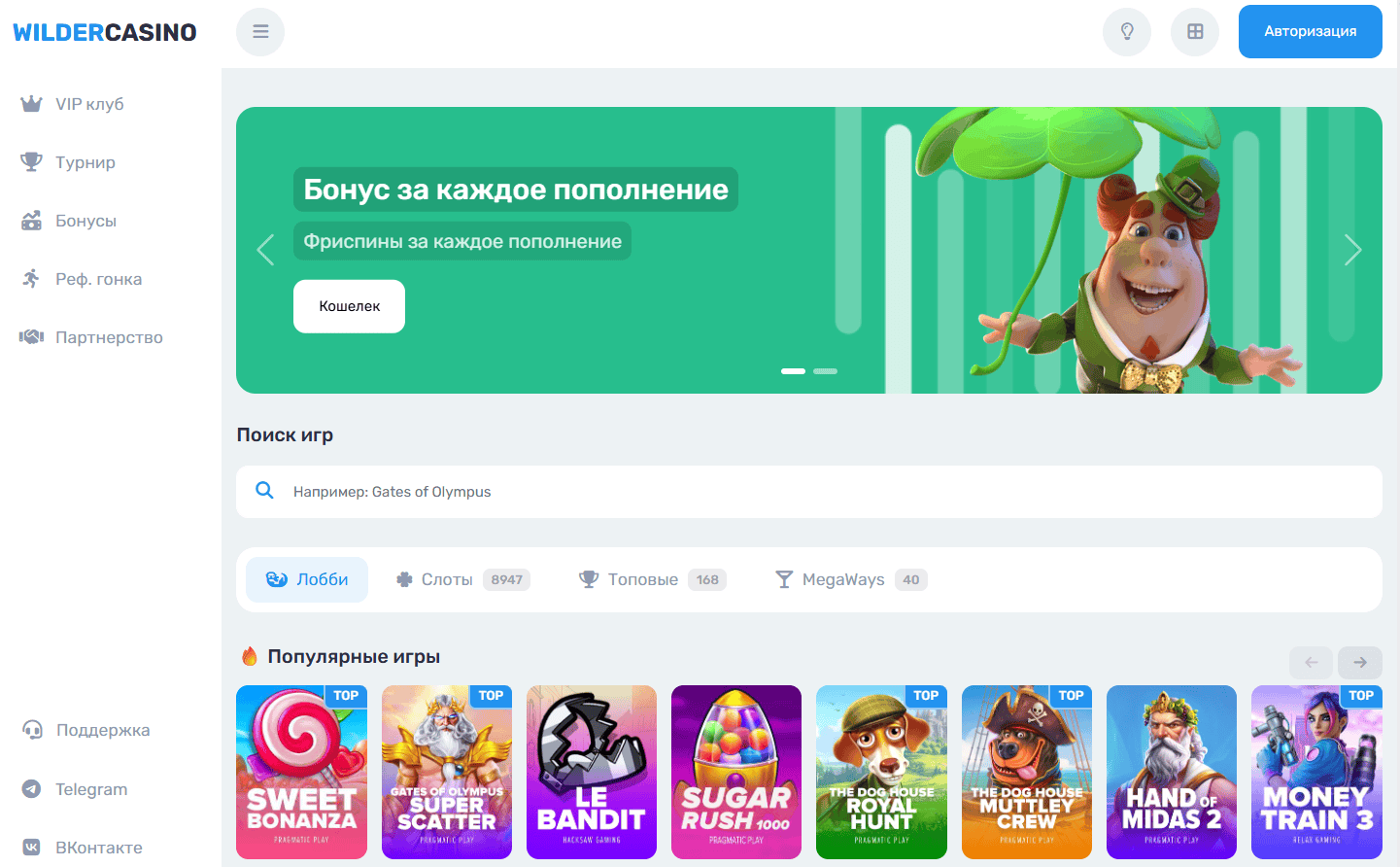 Разделы «VIP-клуб», «Турниры», «Партнёрство» и «Бонусы» добавляют проекту внешнюю солидность. Однако при внимательном изучении условий становится понятно, что WilderCasino не предоставляет юридической информации о лицензии, юрисдикции или регулирующем органе.
