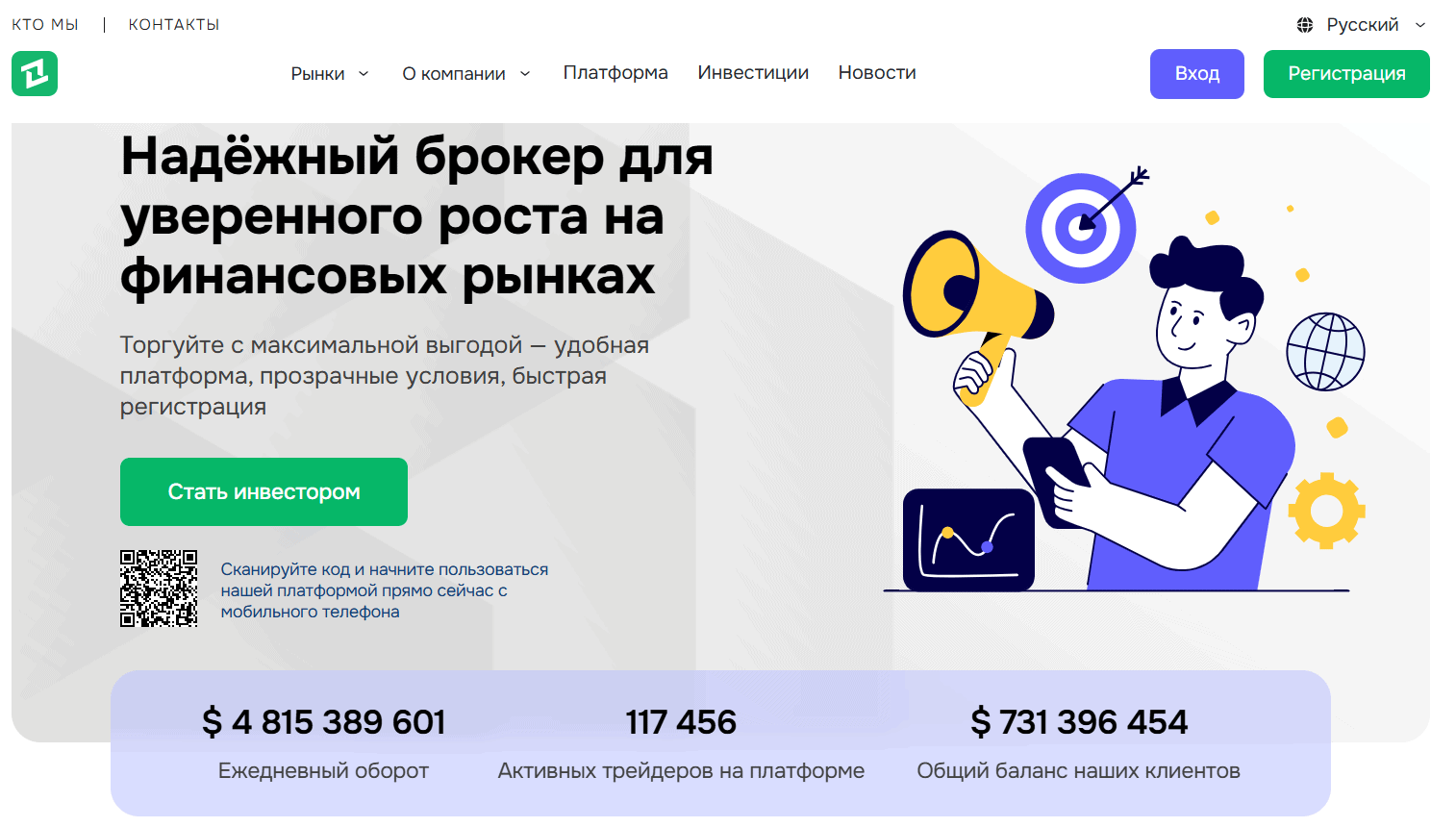 На главной странице указаны: ежедневный оборот свыше $4 млрд, 117 456 активных трейдеров, общий клиентский баланс более $700 млн.